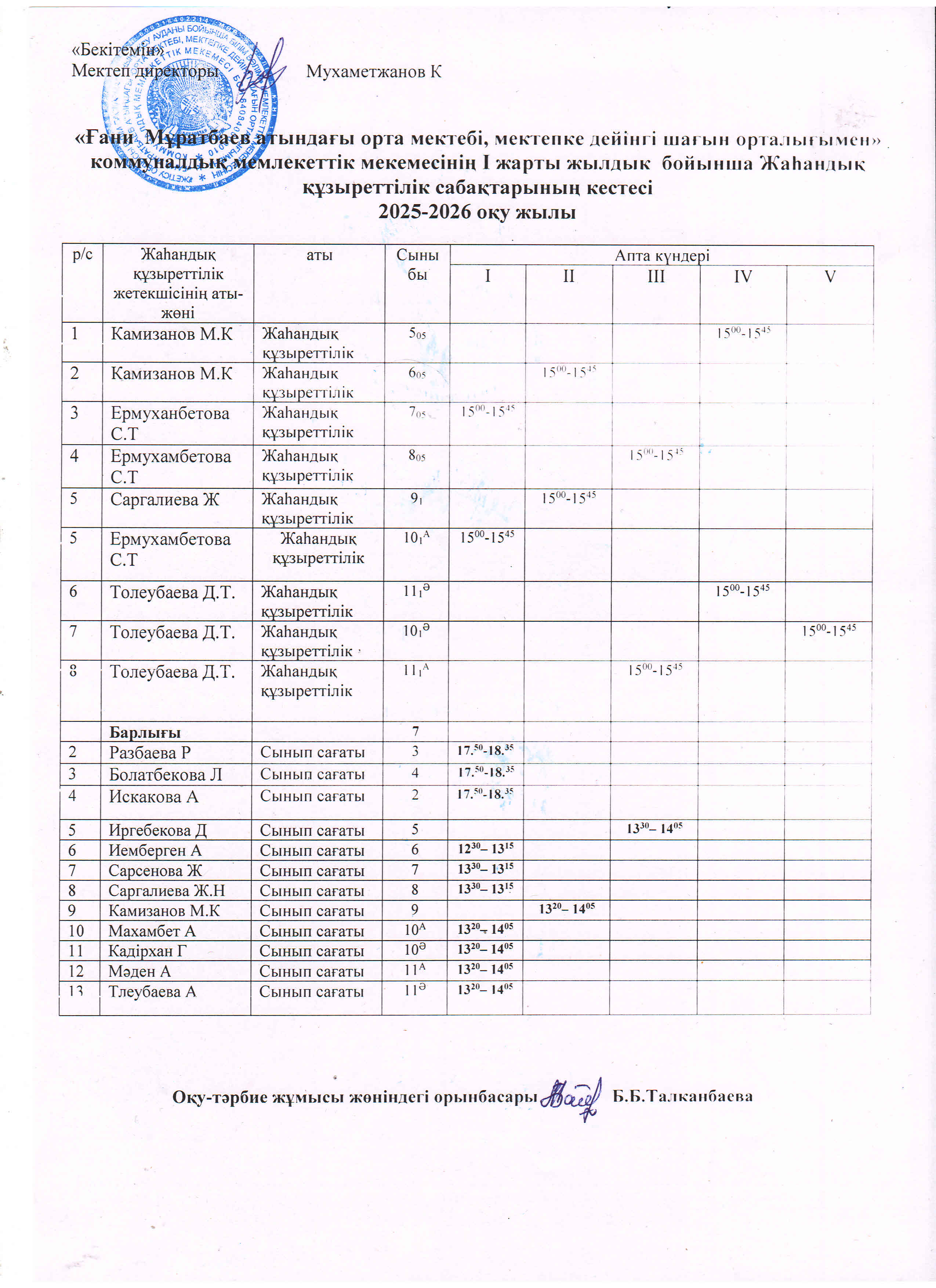 3 940 – 1025 Ағылшын Есіркепова 3 940 – 1025 Орыс тілі Кусмолдина/Қыр 3 940 – 1025 геометрия Каймуханов 3 940 – 1025 Өзін-өзі тану Иманбекова 3 940 – 1025 Казак әдебиет Бөгембаева 3 940 – 1025 Химия Иргебекова 3 940 – 1025 АӘТД Құсамбаев 3 940 – 1025 Дене шынык Ермолданов